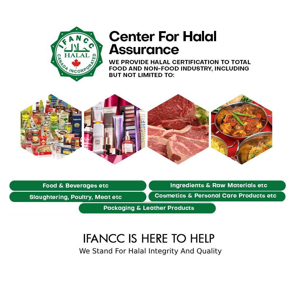 The Islamic Food and Nutrition Council of Canada (IFANCC) is Canada’s leading Halal certifying organization. Our organization offers Halal supervision and Halal certification services in Canada, ensuring your products meet the Highest Halal standards. Canada has Muslim population of 1 million. Thus, there is a tremendous economic opportunity for Canadian companies to meet the needs of Muslims for Halal food products.
